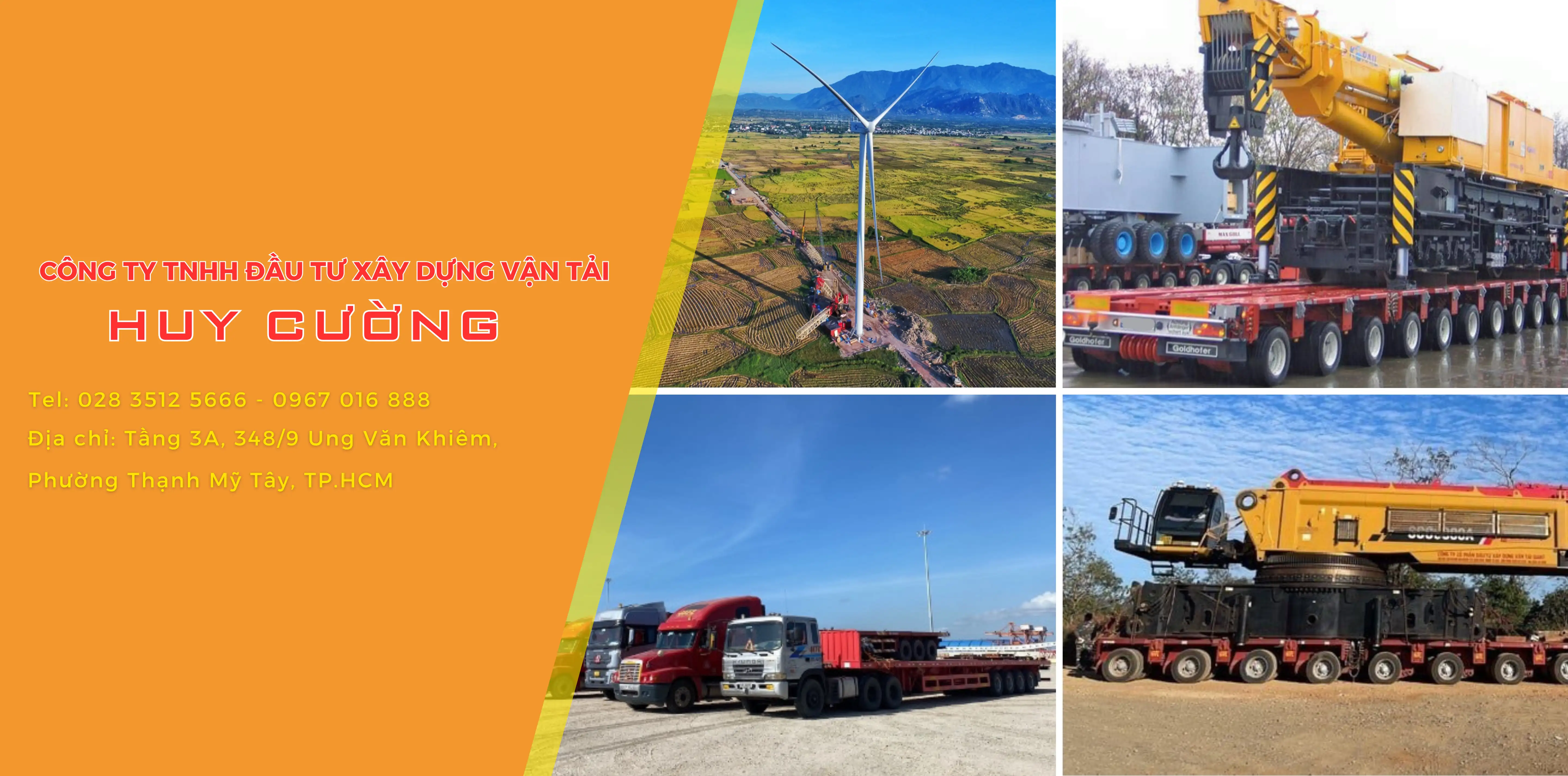 Công ty TNHH Đầu Tư Xây Dựng Vận Tải HUY CƯỜNG (HUY CƯỜNG) là một công ty vận tải và lắp đặt hàng siêu trường siêu trọng, cung cấp dịch vụ logistics trong nước và quốc tế. Công ty được thành lập vào năm 2011 với nhiều năm kinh nghiệm trong lĩnh vực vận tải và lắp đặt các thiết bị siêu trường siêu trọng và các cấu kiện nặng. Các dự án HUY CƯỜNG đã từng điều hành/thực hiện bao gồm vận tải qua các phương thức thủy – bộ thiết bị cho các dự án nhà máy thủy điện, nhiệt điện, điện gió, hạ thủy các cấu kiện giàn khoan, vận chuyển các cấu kiện nặng và thiết bị siêu trường siêu trọng cho nhiều dự án xây dựng cầu đường, khí điện đạm, nhà máy xi măng và các nhà máy sản xuất khác.